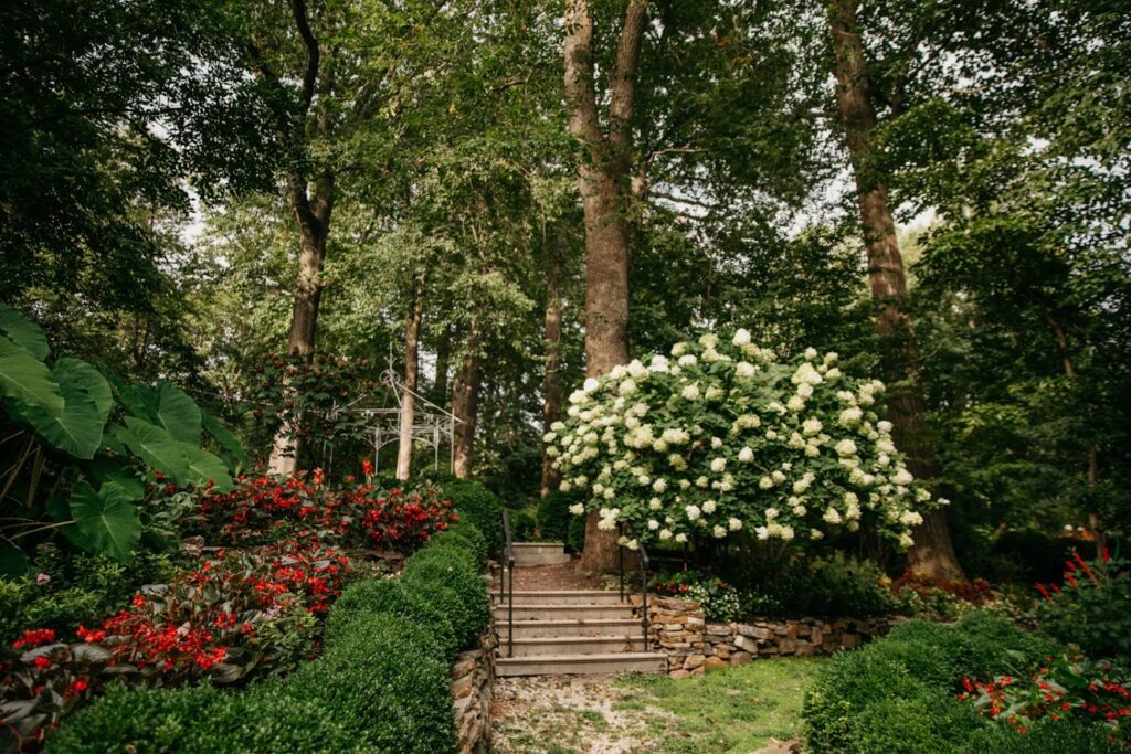 - Gardens are in full bloom with lush greenery.