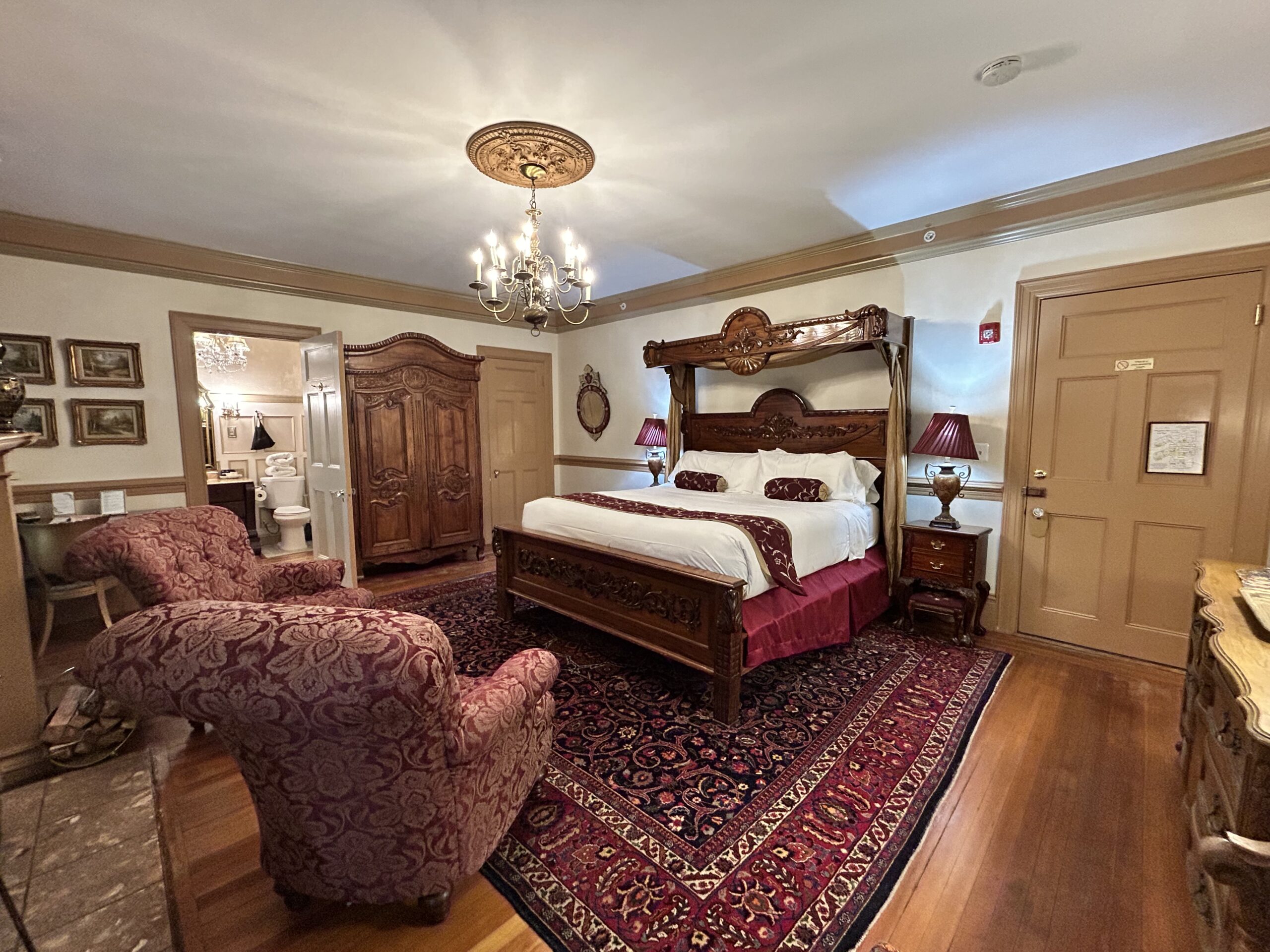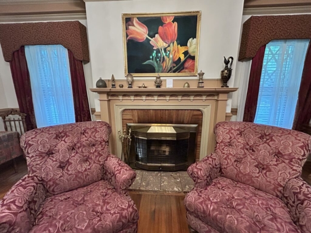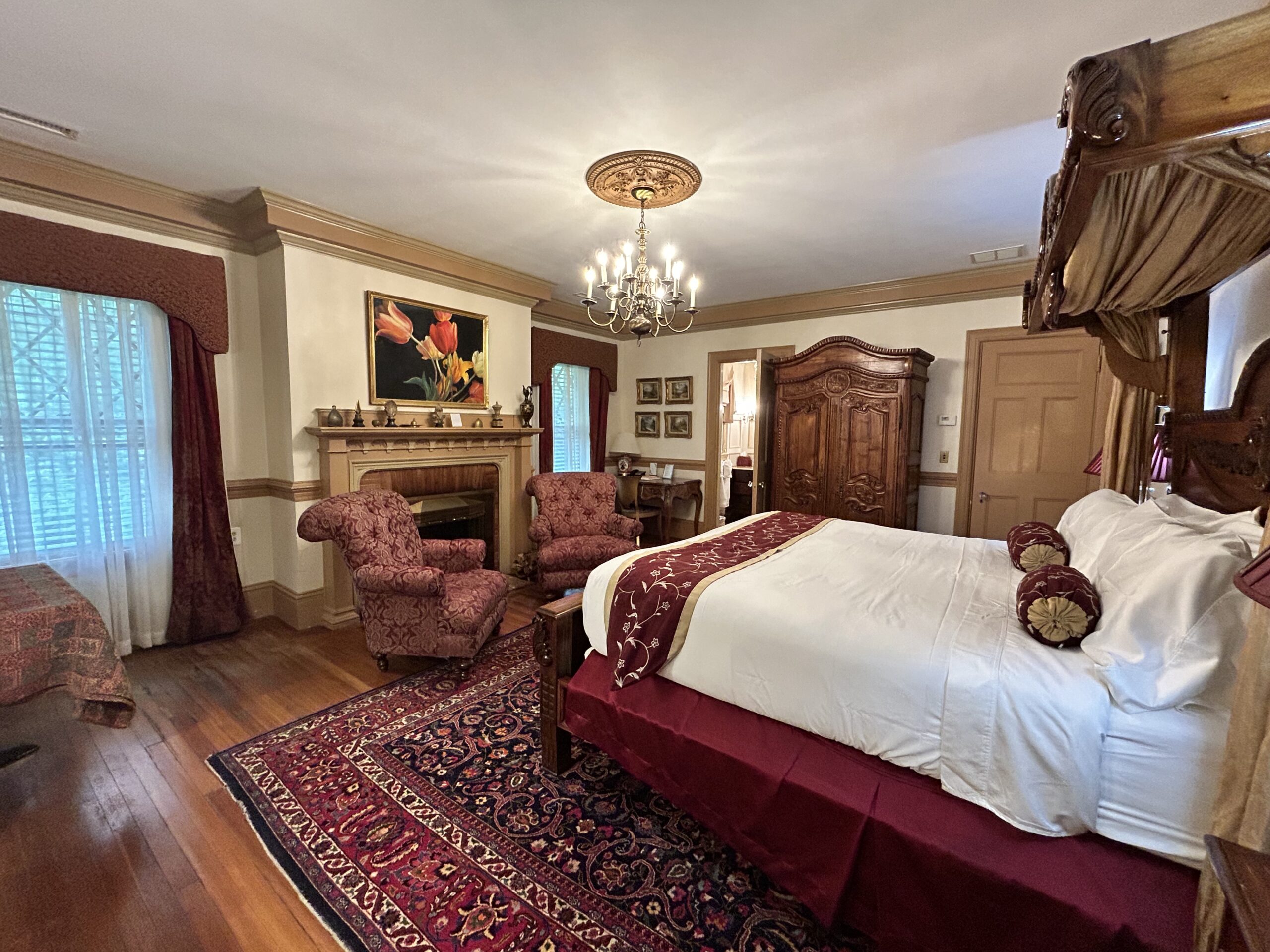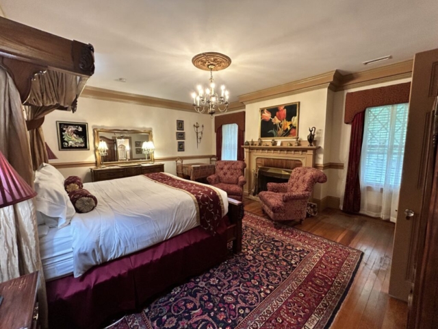 Regale yourself with sumptuous surroundings. This second-floor bed and breakfast room overlooks the Mansion’s beautifully landscaped center-circle garden and features elegant burgundy draperies and furnishings. Drift off to sweet dreams in a comfortable king-size bed with hand-carved headboard. Relax by one of the mansion’s original wood-burning fireplaces and modern, marble shower with two shower heads.