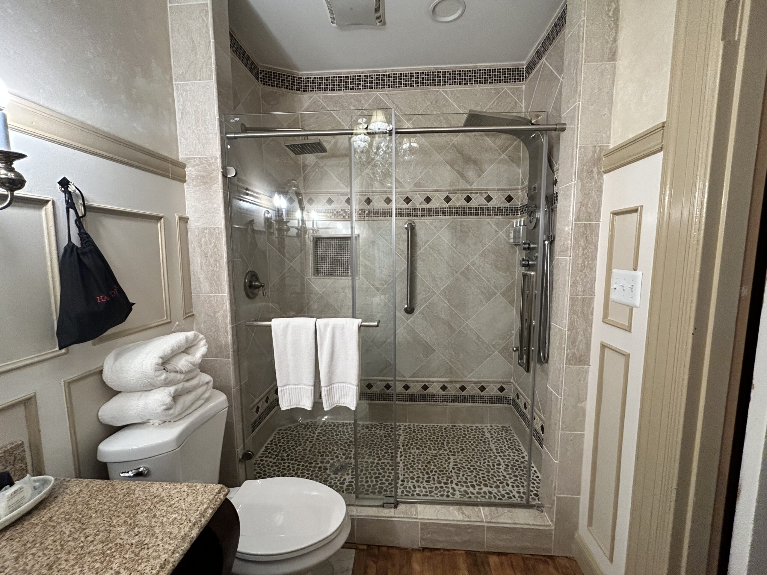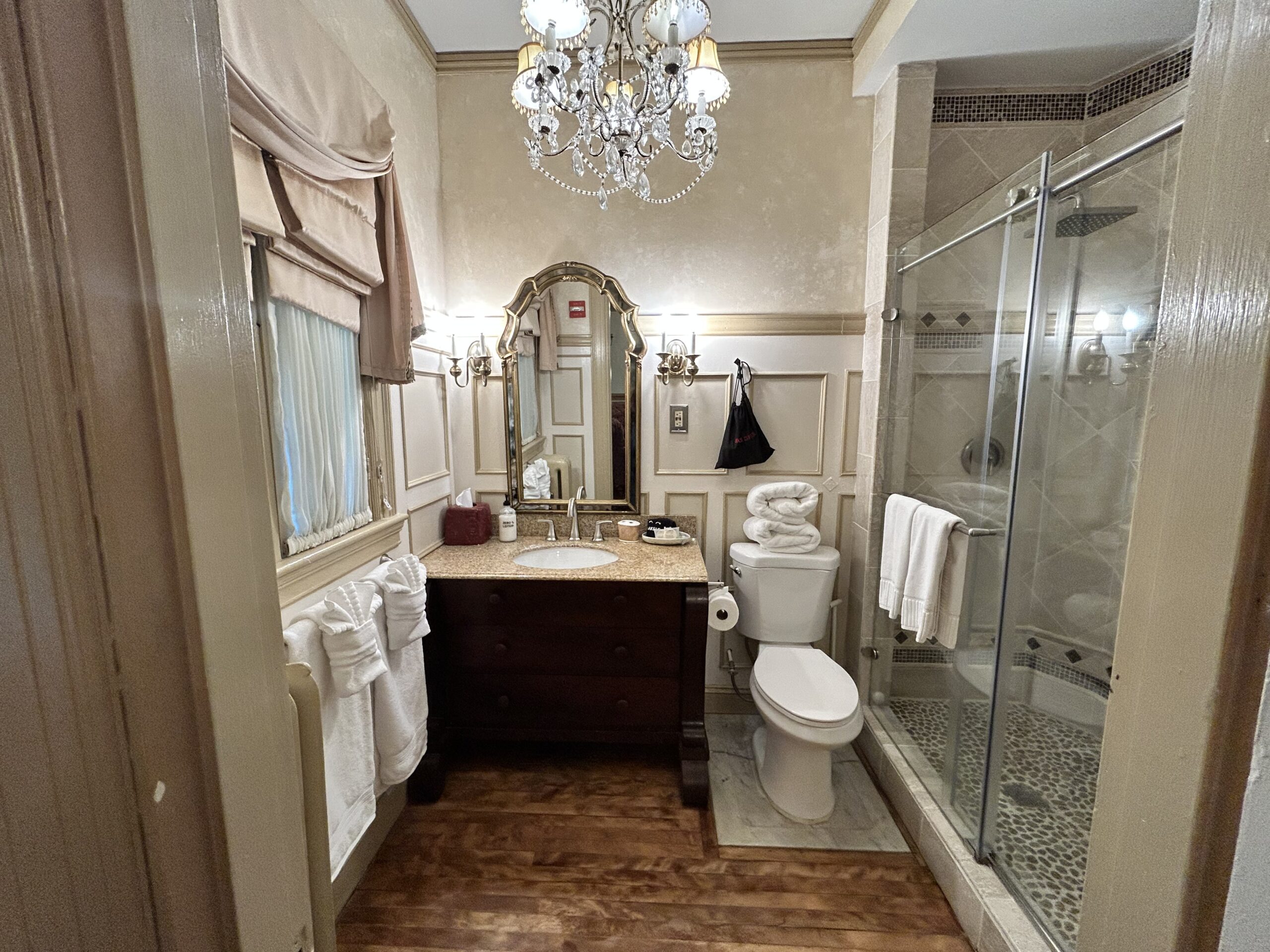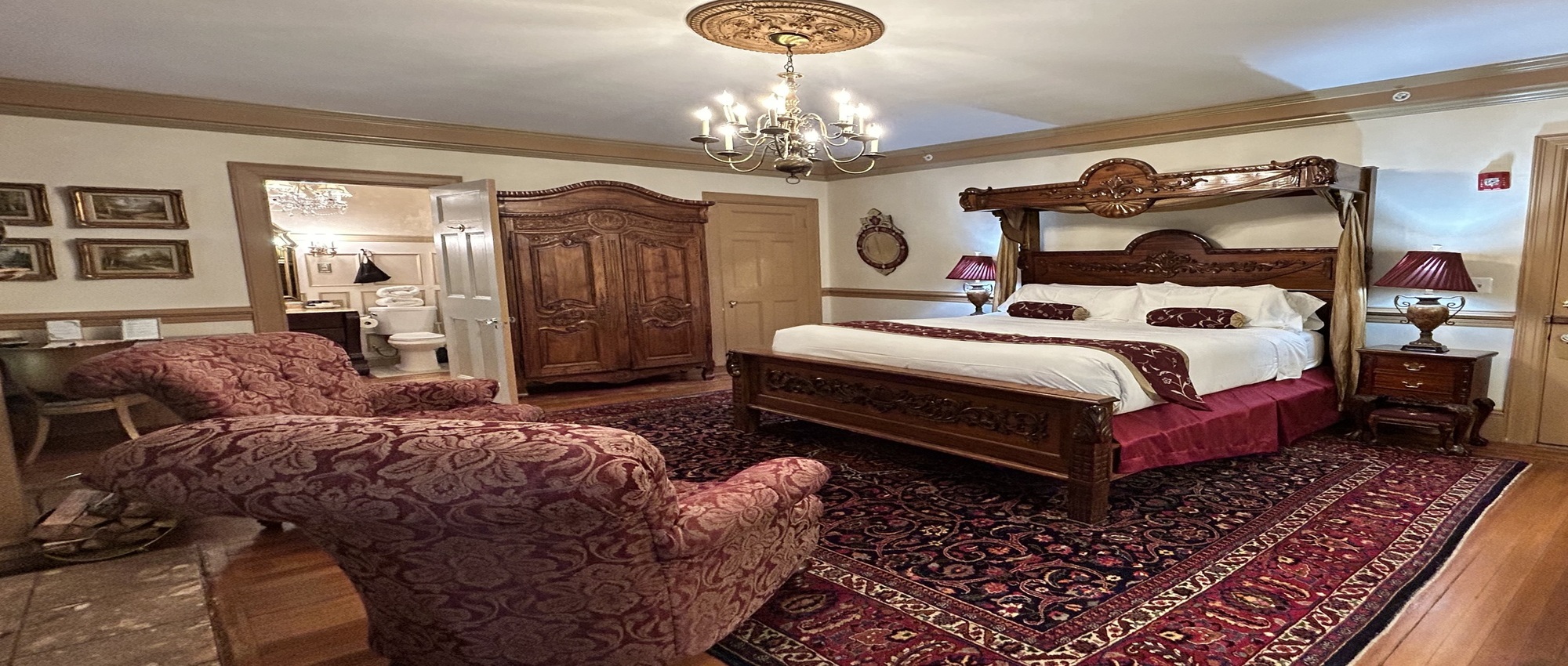Regale yourself with sumptuous surroundings. This second-floor bed and breakfast room overlooks the Mansion’s beautifully landscaped center-circle garden and features elegant burgundy draperies and furnishings. Drift off to sweet dreams in a comfortable king-size bed with hand-carved headboard. Relax by one of the mansion’s original wood-burning fireplaces and modern, marble shower with two shower heads.
