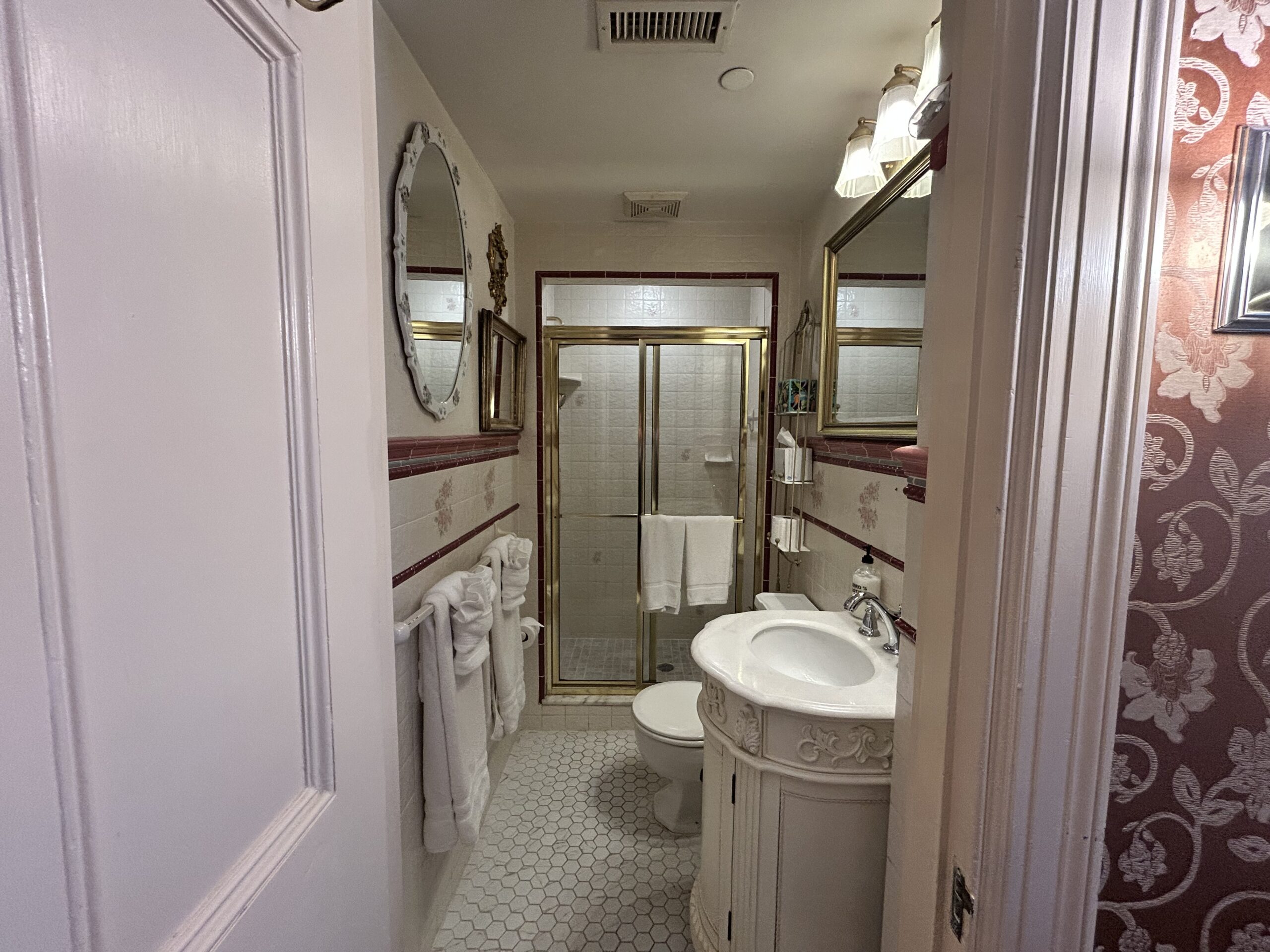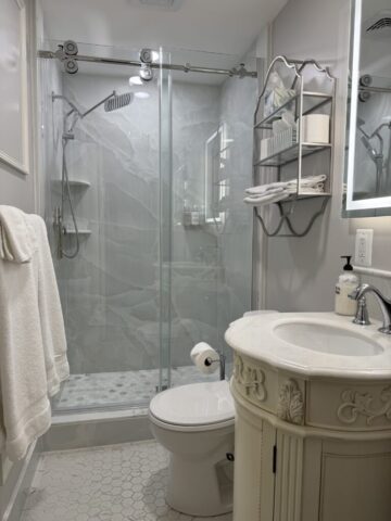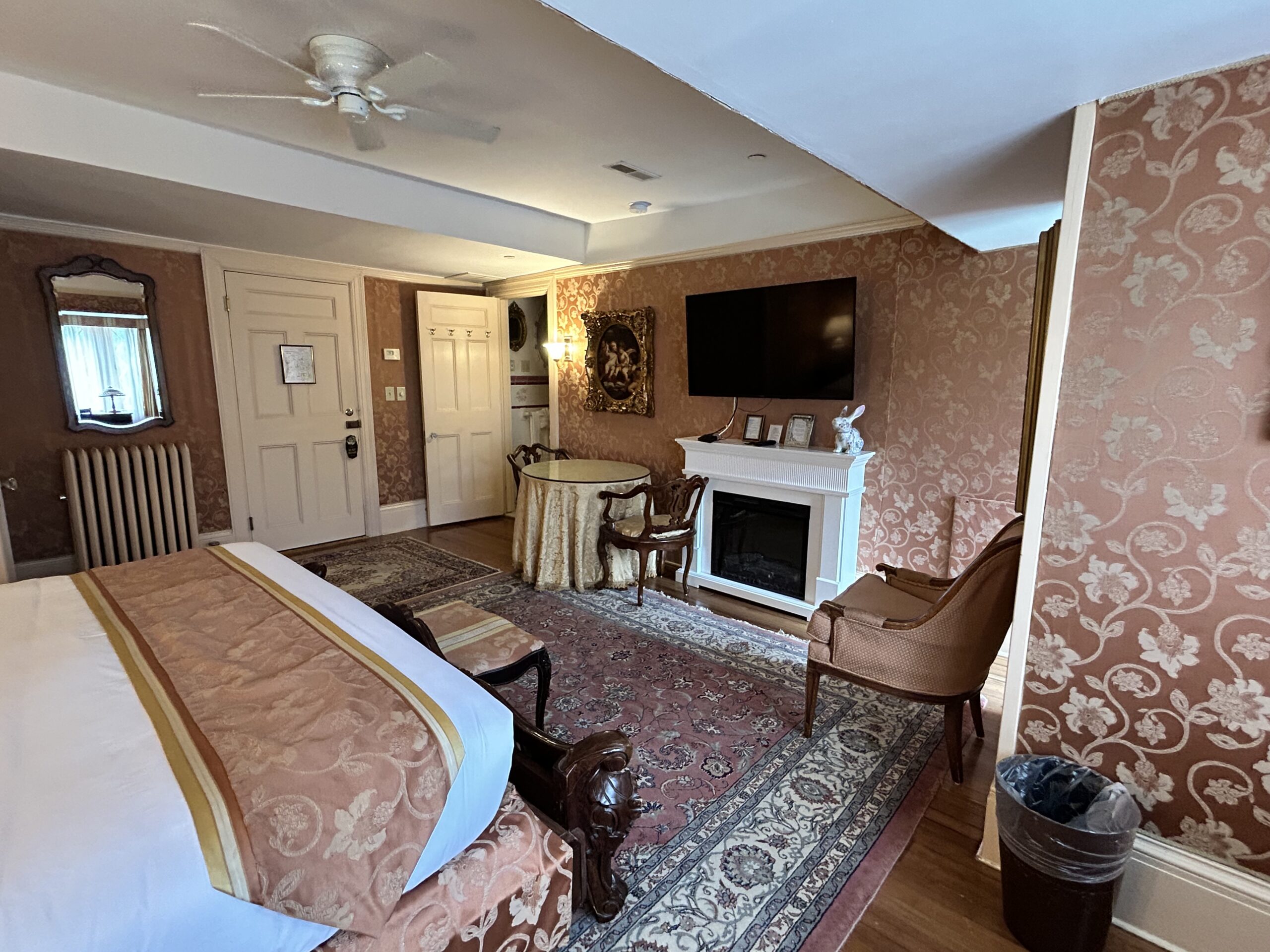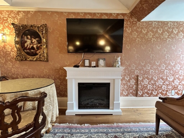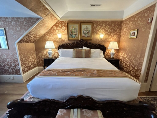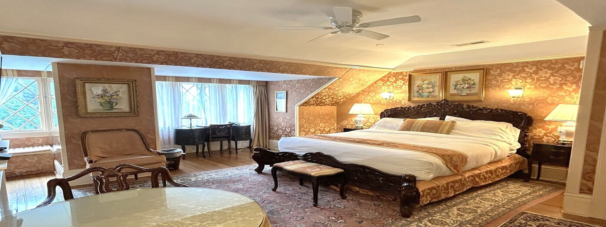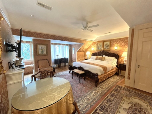Escape to serenity in the Aphrodite’s Retreat, a sun-filled room with oriental carpets and French antiques on the third floor. Awaken to panoramic valley views and watch the sunset over the landscaped gardens and outdoor swimming pool. This guest room features a king-size bed with hand-carved headboard, new electric fireplace and a bathroom with a single glass shower.