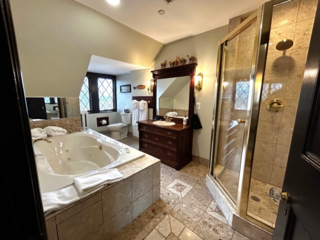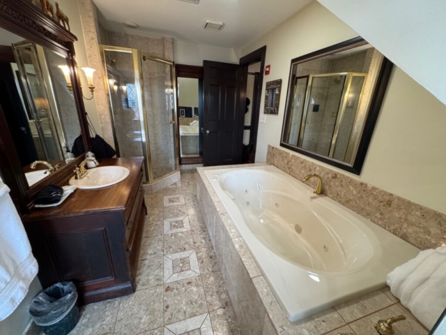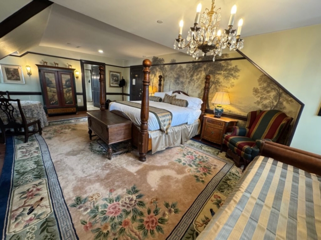 Plan a Baltimore bed and breakfast getaway in the Hunt Room at Gramercy Mansion. Peacefully secluded in Greenspring Valley’s hunt country, this elegant gentleman’s quarters on the third floor features Maryland hunt decor reminiscent of 19th century Baltimore. Unwind in the king-size, four-poster bed. Soak in the double whirlpool tub in the marble bathroom that also boasts a separate walk-in shower. This guest room offers a daybed with trundle to accommodate additional guests, as well as an electric fireplace.