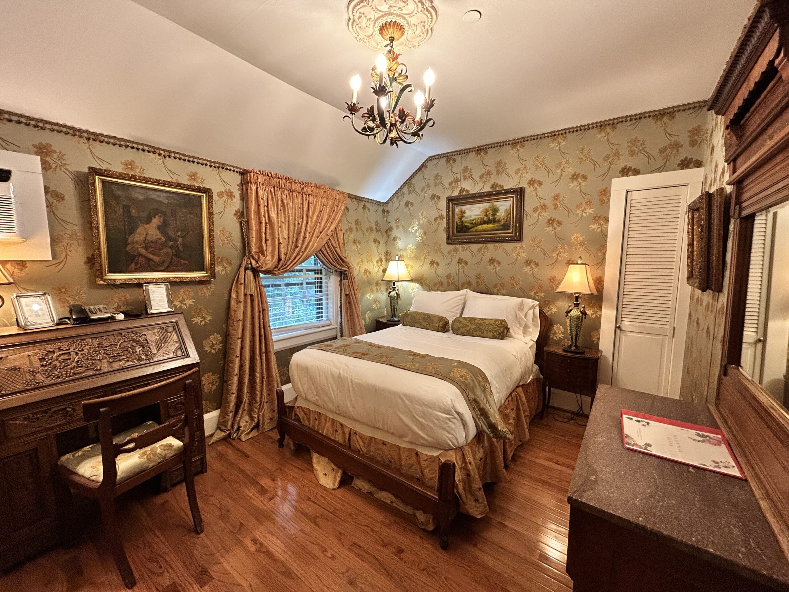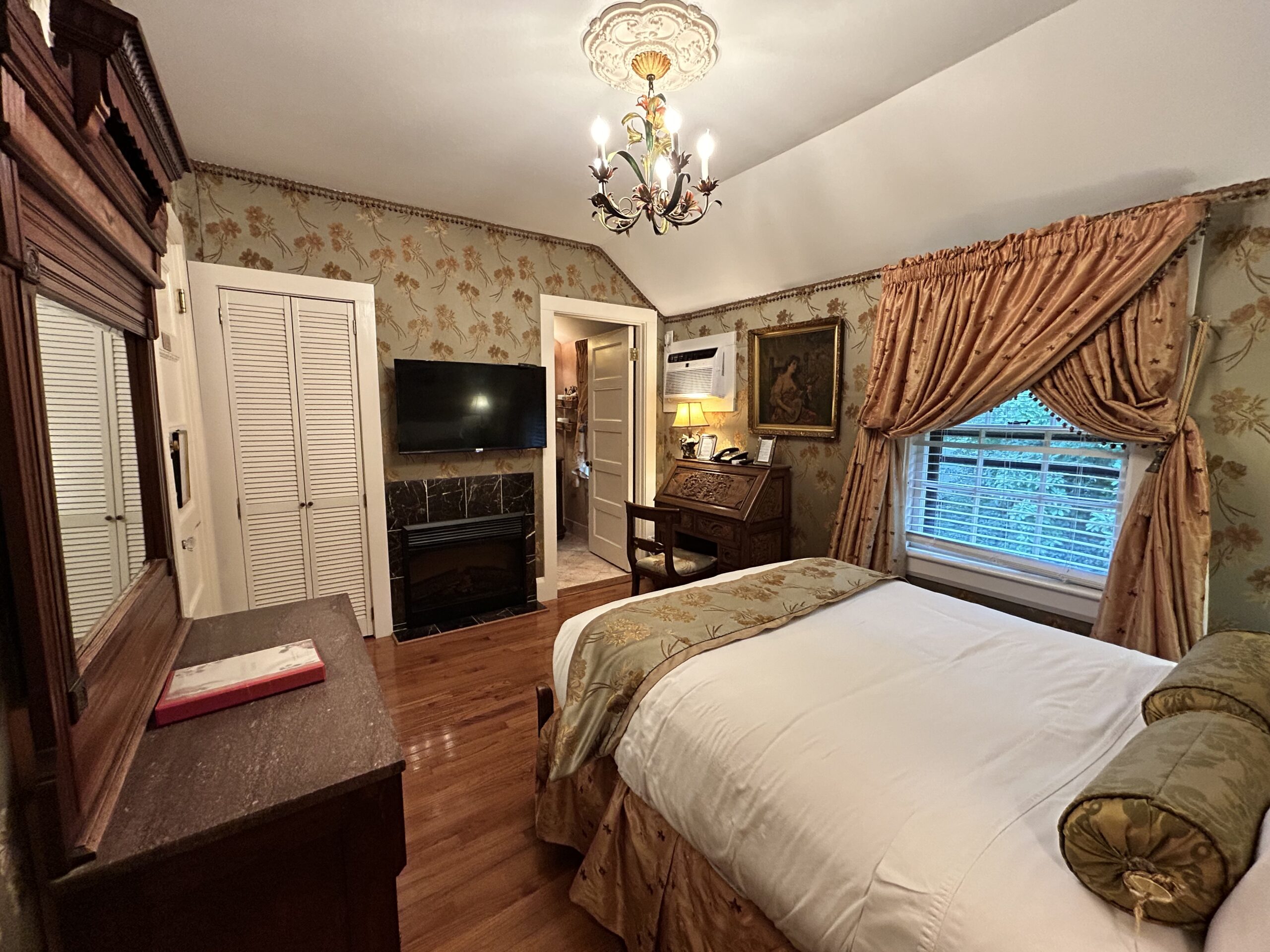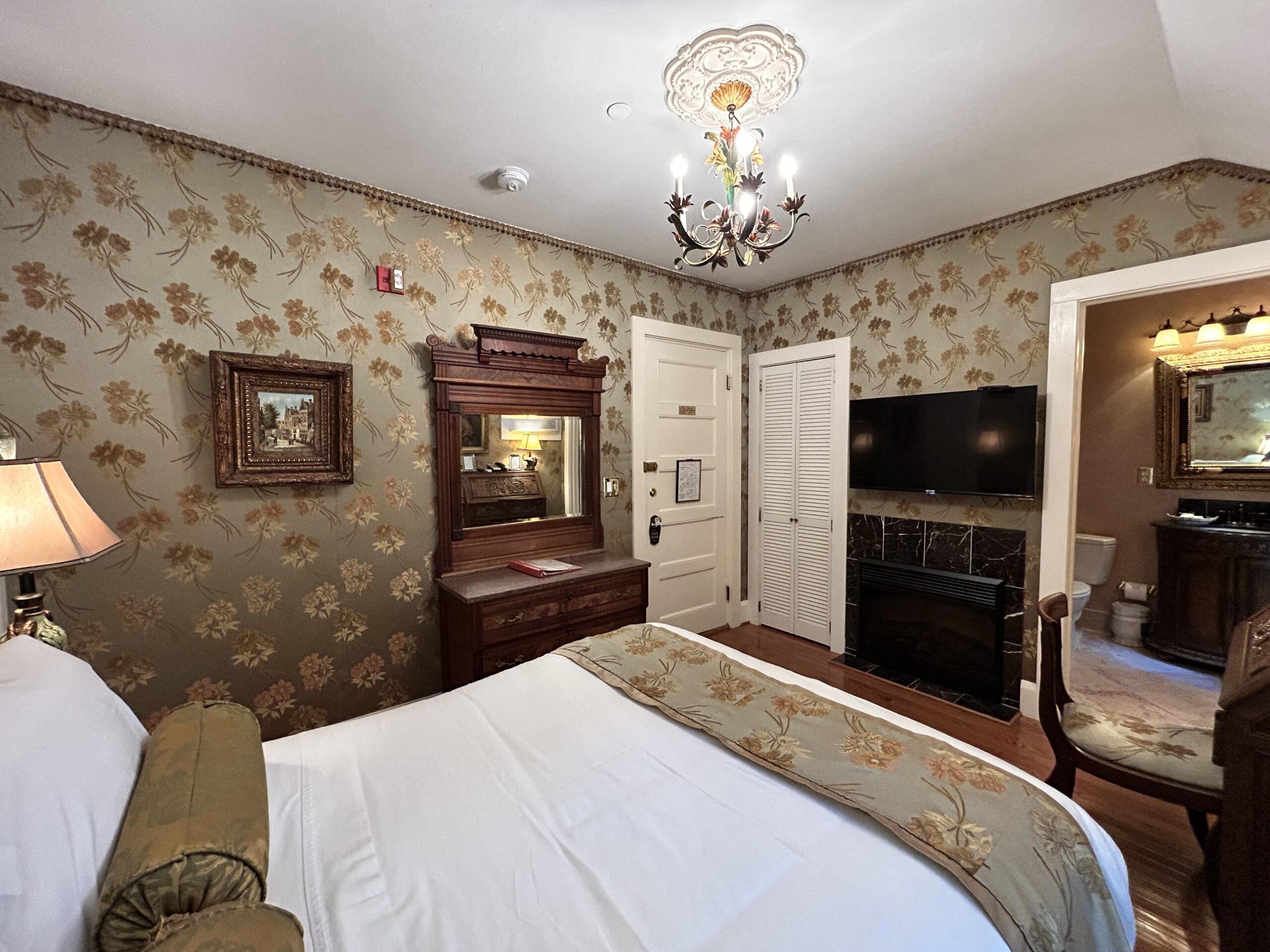 The charming Magnolia Room is located on the second floor of our Baltimore Bed and Breakfast. With a double bed and electric fireplace, this guest room is highlighted with blue and gold fabric walls. The marble-accented bathroom boasts a tiled shower. Conveniently located just a mile and a half from Johns Hopkins at Greenspring Station and across the street from Stevenson University, this guest room offers comfortable accommodations for couples and single travelers.