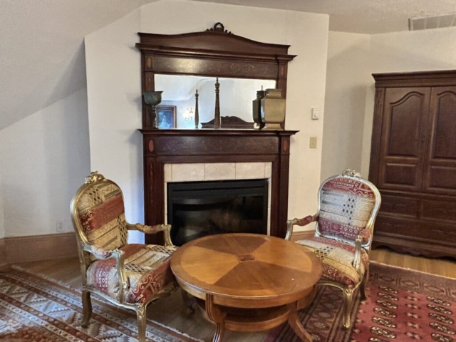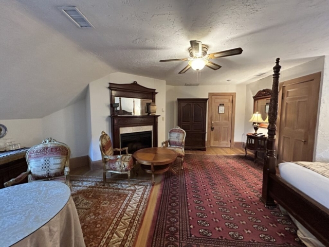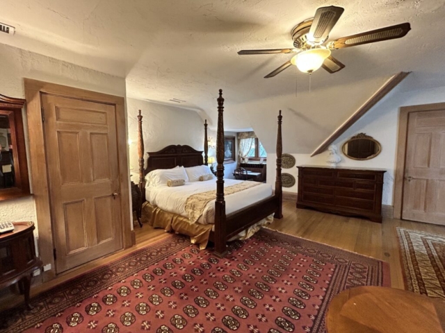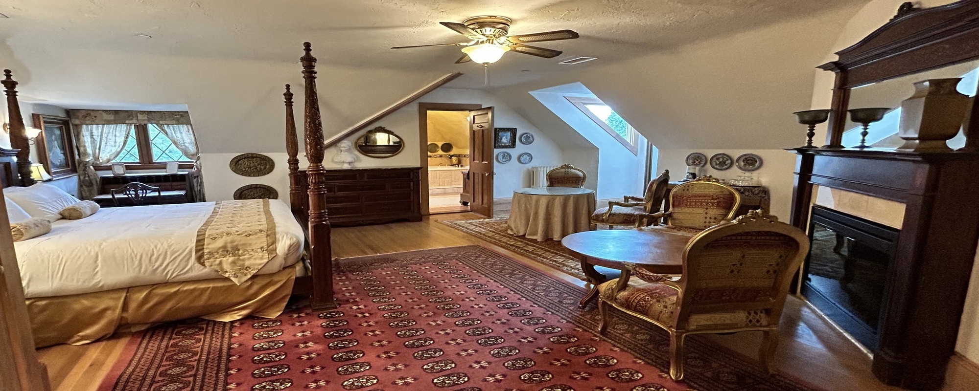 Golden light bathes this third-floor bed and breakfast retreat. The Tower Room’s Renaissance-inspired decor features a four-poster, king-size bed. An antique, inlaid electric fireplace provides a cozy seating area. The spacious Italian-tiled bath boasts a separate walk-in shower and our largest double whirlpool tub. Escape to elegance and warmth in this charming and private guest room.